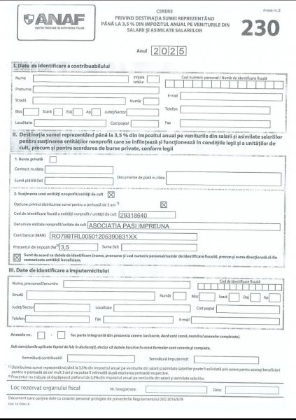 Daca aveţi venituri doar din salariu şi decideţi direcţionarea a 3.5 % din impozit către ASOCIATIA PASI IMPREUNA, vă rugăm să completaţi Declaratia 230  cu  datele dvs. şi să o trimiteţi la administraţia financiară de care aparţineţi.